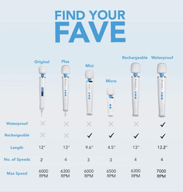 Choosing the right Magic Wand doesn’t have to be complicated. This comparison gives you a clear, side-by-side overview of each model, highlighting key differences such as size, power, speed options, and rechargeable features.